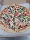 Tomatoes , fresh garlic, roasted red peppers, black olives, feta, provolone & mozzarella.