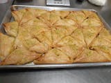 A rich, sweet dessert pastry made of layers of filo filled with chopped nuts and covered in honey.