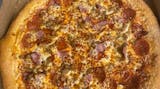Beef , pepperoni, sausage, mushrooms, bacon, provolone & mozzarella cheese.